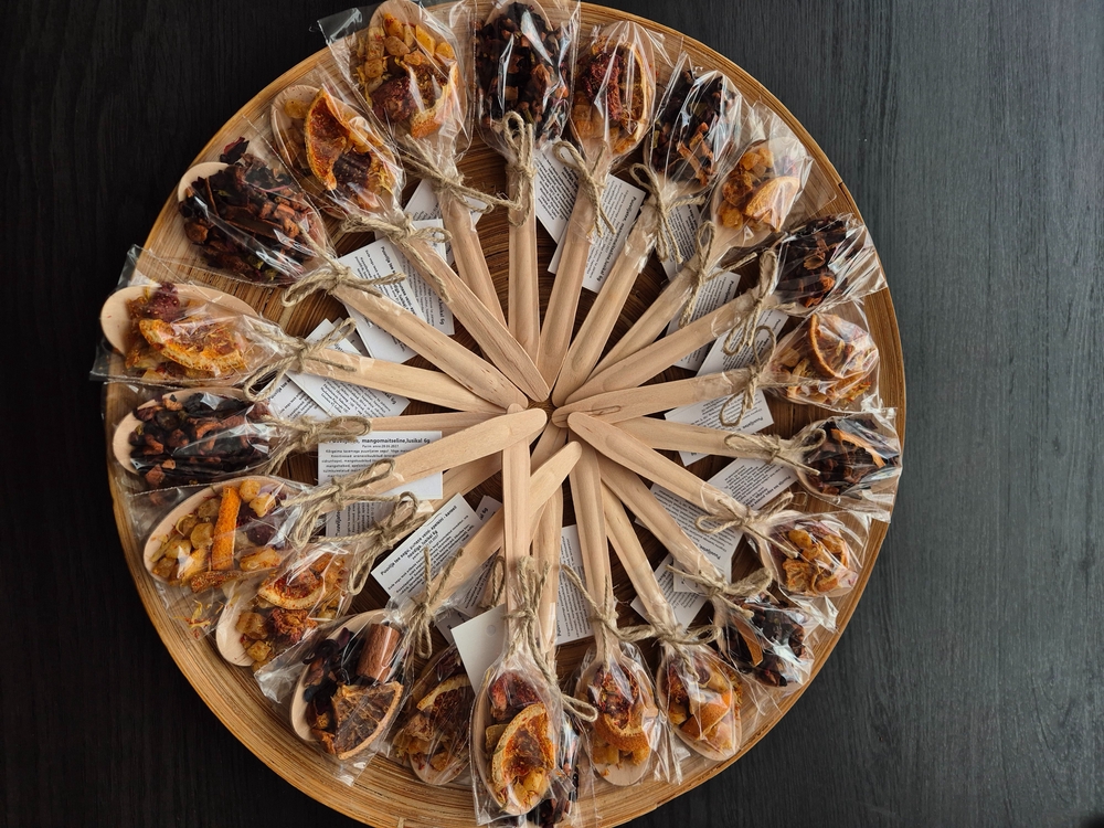 Koostisosad: ananassikuubikud (ananass, suhkur, hapendaja sidrunhape), mangokuubikud (mango, suhkur, hapendaja: sidrunhape), mangohelbed, apelsinikoor, ananassihelbed, lõhna- ja maitseaine, külmkuivatatud mandariinitükid, safloor, saialilleõied, külmkuivatatud maasika viilud.